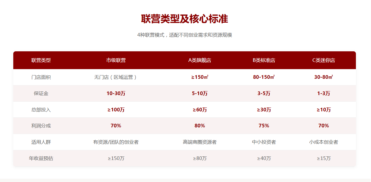 市级联营+A/B/C类门店联营模式,总部兜底低风险,利润分成高回报,无需经验也能轻松开店