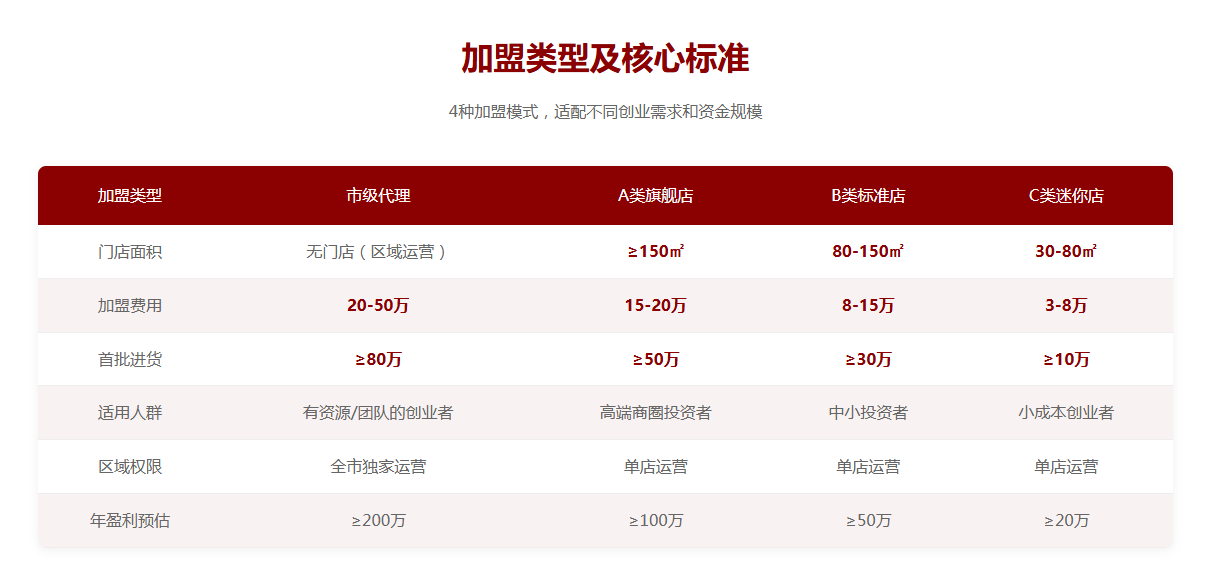 市级代理+A/B/C类门店多类型加盟模式,低投入、高回报,总部全流程扶持,无需经验也能轻松开店